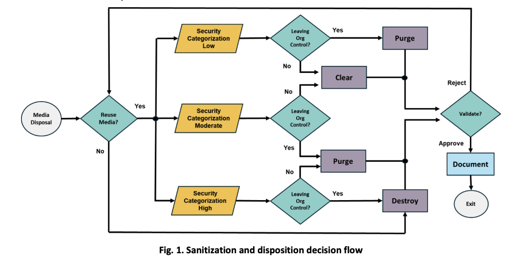 The above NIST decision flow shows how to choose the appropriate method for wiping storage media based on data sensitivity and whether the device will remain within the organization. First, you identify the data’s sensitivity level. Then you decide if the hardware will be reused internally or sent somewhere else. Those two factors determine whether you should clear, purge, or destroy the media. NIST also notes that not every device supports every sanitization method, and organizations may accept some risk when dealing with moderately sensitive data. After choosing a method, the final steps are to verify that the secure erase procedure was successful and subsequently record what was done for auditing and compliance.