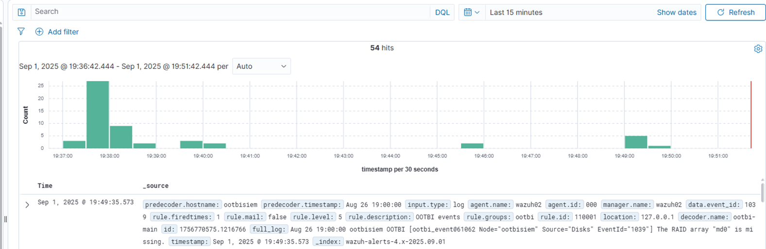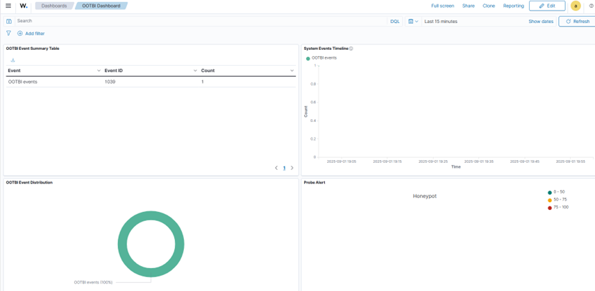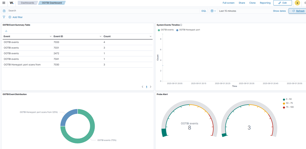 5. You should see events lighting up in the Ootbi dashboard and corresponding entries in your Wazuh SIEM dashboard.