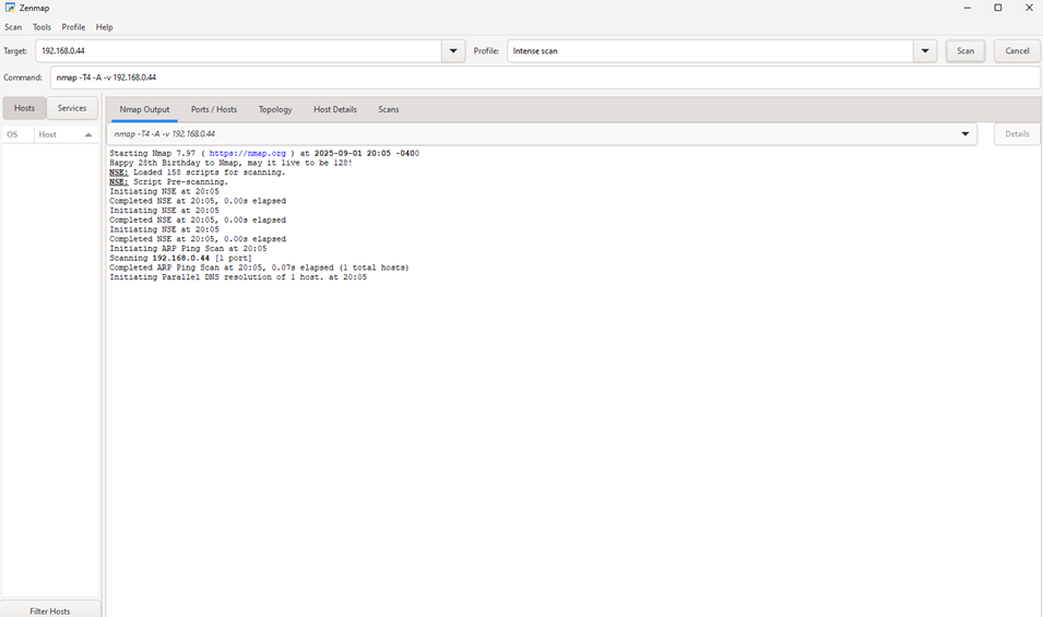 3. If your Honeypot is running on a static IP (mine, for example, is 192.168.0.44), scan it using Zenmap.