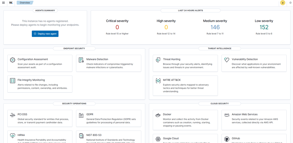4. Log in using the username admin and the password that appeared in your terminal after completing the installation script. Once logged in, Wazuh will present a rich dashboard full of options to explore.