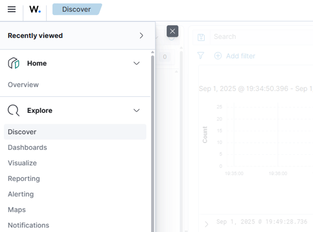 In the Wazuh dashboard, open the top-left menu and click on “Explore” then “Discover.”
