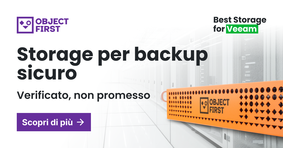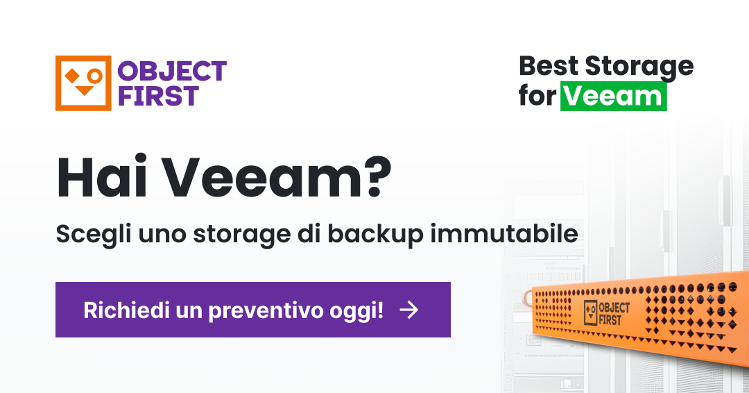 Immuni al ransomware e immutabili out-of-the-box, Ootbi di Object First è costruito sui più recenti Zero Trust e principi di sicurezza dei dati e offre S3 nativo immutabile storage a oggetti progettato e ottimizzato per prestazioni di backup e recupero imbattibili con Veeam.