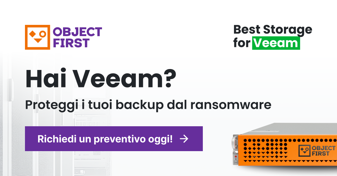 Ootbi di Object First è un dispositivo di backup WORM offline basato su software utilizzando un insieme di dischi rigidi e un sistema operativo Linux rinforzato per fornire una difesa di alto livello contro il ransomware. Esplicitamente progettato per Veeam, Ootbi si inserisce in una strategia di backup 3-2-1 raccomandata come una delle migliori pratiche per la protezione dei dati.